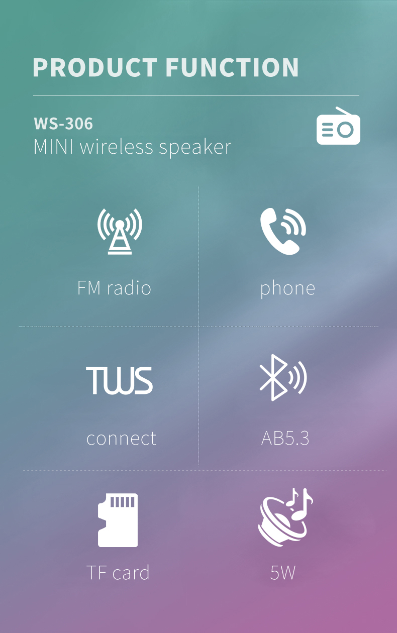 * Features: Bluetooth playback, TF card reading, FM radio, TWS boot automatic interconnection, stereo, selfie