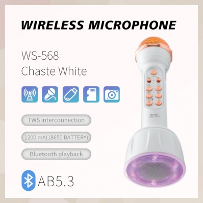 无线蓝牙麦克风1.K歌,播放/本地录音,一键删除;2.FM收音,USB、TF读卡;3.酷炫环绕彩灯;4.魔音调声功能;5.音源输入,耳机,蓝牙播放,蓝牙接打电话,蓝牙自拍,麦克风。
