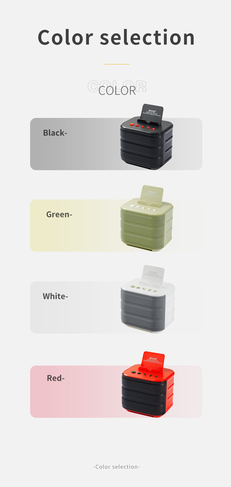 产品型号:WS-1029 可选颜色:绿、黑、红、白 喇叭规格:2.5寸 4Ω8W 电池容量:1200maH电池 输出功率:7W 蓝牙版本:AB5.3 传输距离:10米 标准配件:音频线,充电线 毛 重:22.6KGS 机身尺寸:10*11*12CM 外箱尺寸:61*29.7*53CM 包装数量:40 PCS