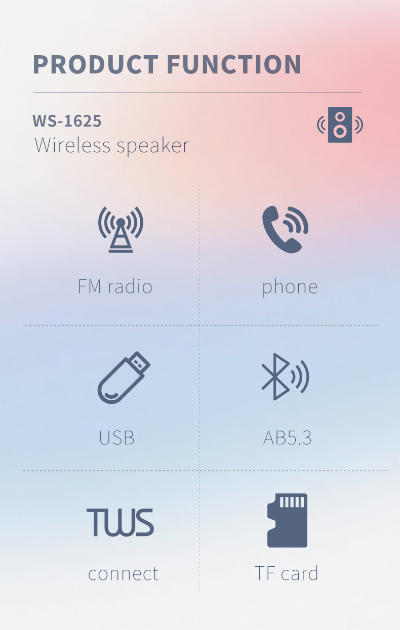 产品详情 产品型号:WS-1625 可选颜色:绿、蓝、红、黑 喇叭规格:2.5寸全频喇叭 4Ω8W 电池容量:1800mAh电池 输出功率:7W 蓝牙版本:AB5.3 传输距离:50米 标准配件:音频线,充电线 毛 重:20.5KGS 机身尺寸:17*8*17CM 外箱尺寸:53*42*60.7CM 包装数量:30 PCS