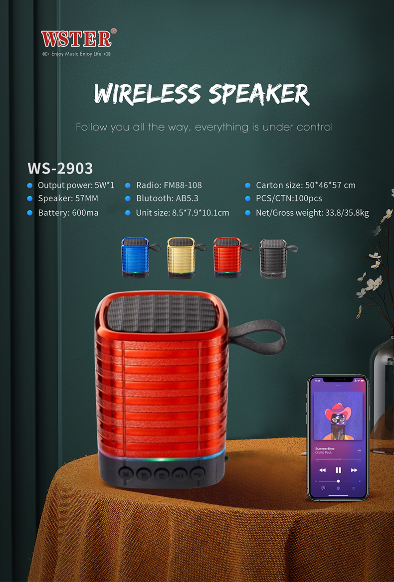产品型号:2903 可选颜色:黑、蓝、金、红、银 喇叭规格:57MM 4Ω5W 电池容量:5C,600MA/H 输出功率:5W 蓝牙版本:AB5.3 传输距离:50米 标准配件:音频线,充电线 毛 重:35.8 KGS 机身尺寸:8.5*7.9*10.1 CM 外箱尺寸:50*46*57 CM 包装数量:100 PCS