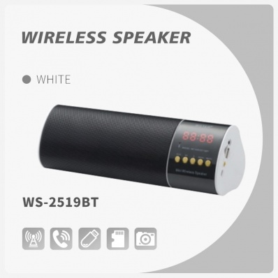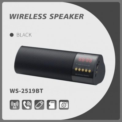 产品型号:2519BT 可选颜色:黑、灰、白、红 喇叭规格:78MM 4Ω10W 电池容量:内置18650锂电池,1500MA/H 输出功率:10W 蓝牙版本:AB5.3 传输距离:50米 标准配件:音频线,充电线 毛 重:32.2 KGS 机身尺寸:28*9*9.5 CM 外箱尺寸:60.5*52.5*44.5 CM 包装数量:40 PCS