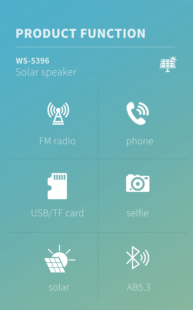 *功能:蓝牙播放,自拍,读U盘,TF卡,FM收音,TWS互联,太阳能充电,强光手电