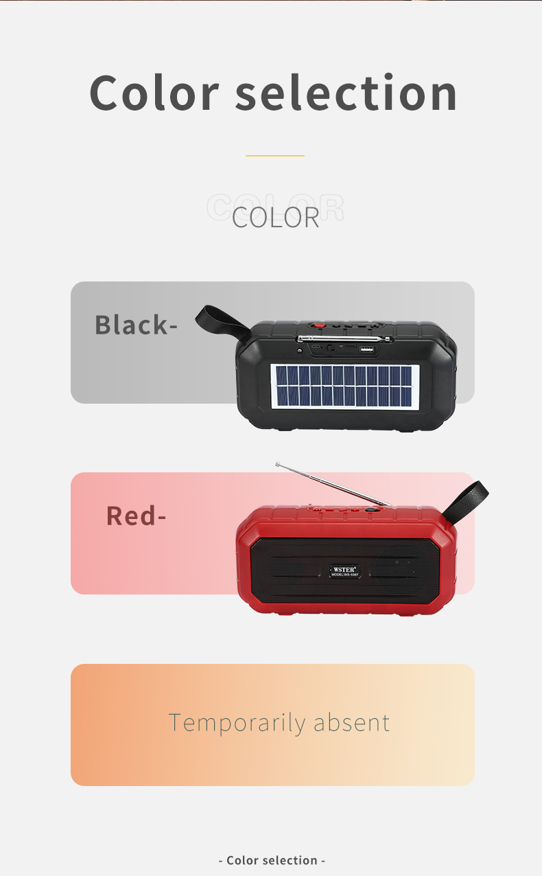 *功能:蓝牙播放,自拍,读U盘,TF卡,FM收音,TWS互联,太阳能充电,强光手电