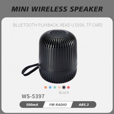 *型号:WS-5397 *功能:蓝牙播放,读U盘,TF卡,FM收音, *输出功率:1*5W *喇叭:52MM*1 *震模:有 *电池:500毫安 *收音: FM 88-108 *蓝牙版本:AB5.3 *颜色:黑,绿,蓝,白,粉 *产品尺寸:7*7*8.8CM *卡通尺寸:41.7*38.7*43CM *PCS/CTN:100 *净重/毛重:26/27KGS *输入电压:5V